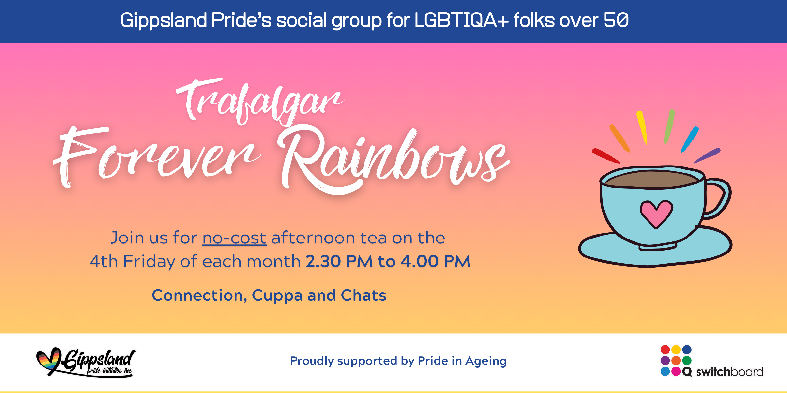 Gippsland Pride are so pleased to invite our community to “Forever Rainbows” a new social group for LGBTIQA+ folks over 50+ – a monthly social connection at the Gippsland Pride Hub in Trafalgar (and yes, similar opportunities will be popping up across Gippsland in the coming months).