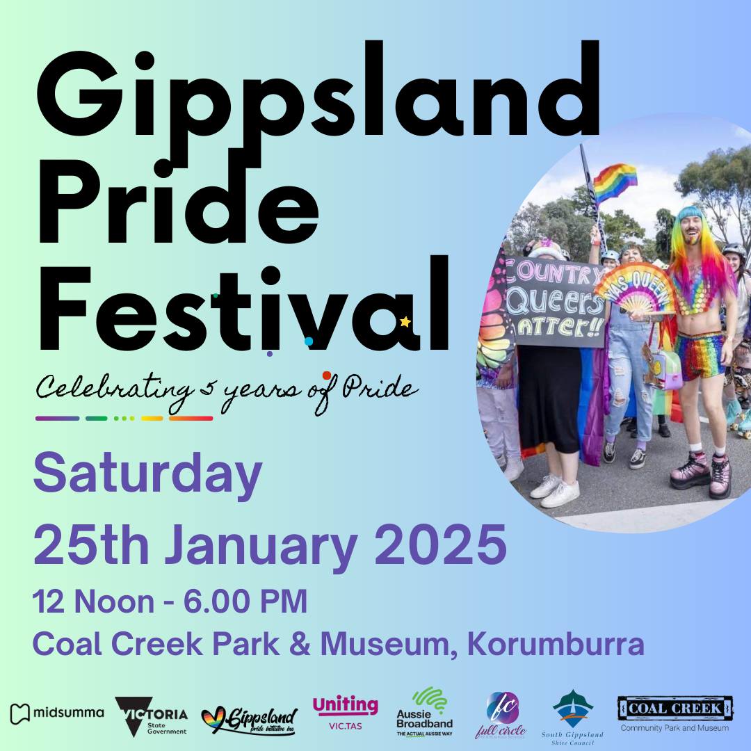 The Gippsland Pride Initiative are pleased to invite Expressions of Interest from Community Groups, Service and Support Organisations and related stall holders to join us for a special event at Gippsland’s Annual (LGBTQIA+) Pride Festival Day at Coal Creek Community Park and Museum (Korumburra) on Saturday 25th January 2025.